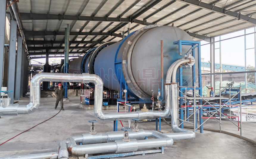 鼎力蒸汽煤泥烘干機主要由熱源、喂料裝置、帶式上料機、回轉滾筒、帶式出料機、引風機、除塵器和配電柜構成。